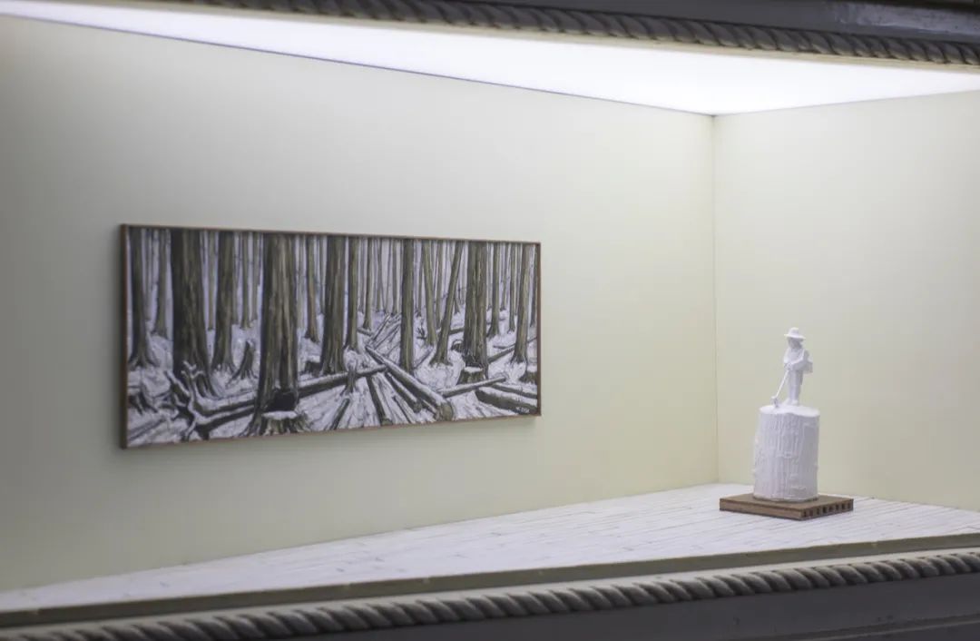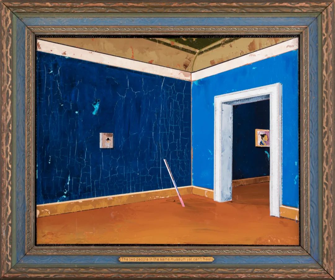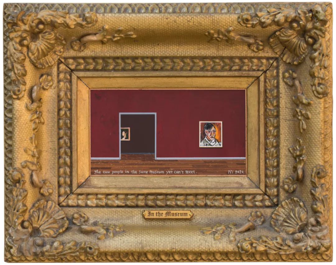 《在同一个美术馆不能见面的两个人》系列还有几张描绘博物馆空间,如《在同一个美术馆不能见面的两个人》。一幅16世纪的女人肖像和20世纪的男人肖像,被分散在两个展厅中彼此无法对照,这既是美术史,也是我们的日常生活,“像同一个写字楼里面工作的人,每天可能进进出出同一部电梯,但是互相不认识。”