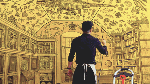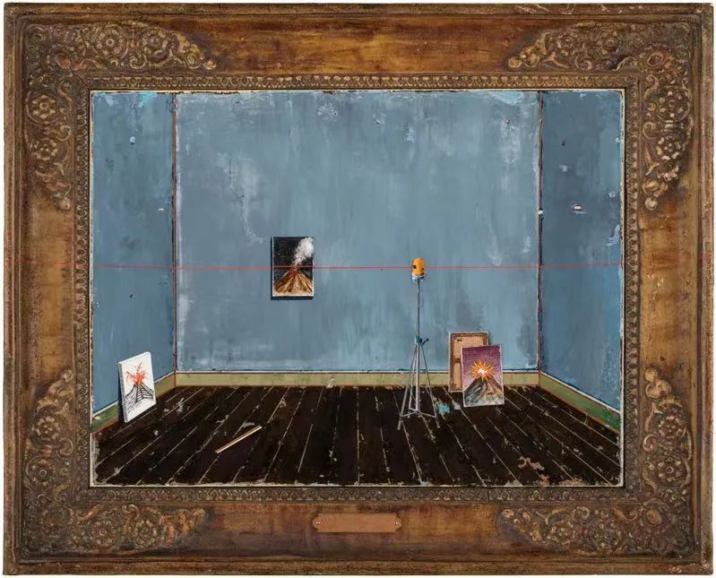 《博物馆的余晖》目前最大的一幅《博物馆的余晖》,用时超过半年。画面主体来源于1599年的意大利,人类历史上最早的私人博物馆的一幅古版画。他把陈列架上的物件,换成了自己的作品,“完成之后的水冲绘画,就像把一种残留的余晖凝固下来。”