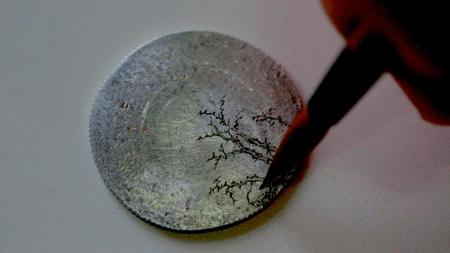 《银河计划》创作过程他掏出几块硬币,用铁锤一点一点地把它们砸平。货币的附加值在过程中一点点被抹去,然后在一两厘米的金属片上面重新画出一张微型的绘画,从而产生出艺术的附加值。