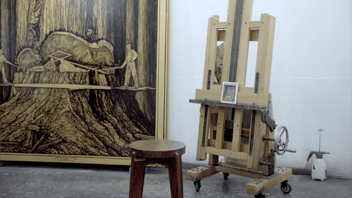 创作大尺幅水冲绘画时,他需要在工作室里面穿好套鞋,用水枪去冲刷,一张大画可能要用一吨多的水,持续冲刷一个月以上。