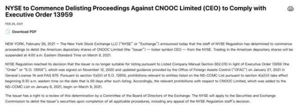 纽交所表示,将于3月9日凌晨4点暂停CEO的交易。该所并未公布计划何时完成中海油的摘牌程序。