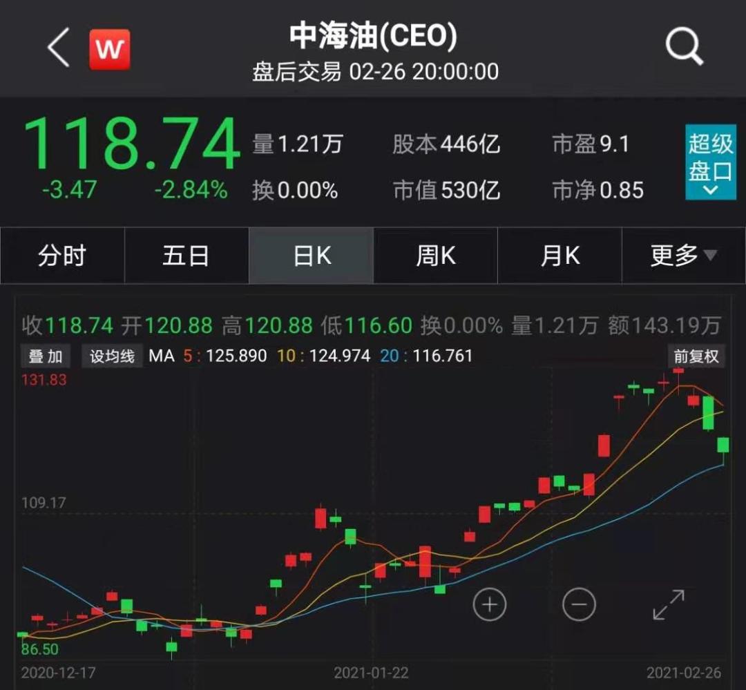 美国前总统特朗普去年11月签署了一项禁止美国人投资“有军方背景的中国企业”的行政令。在中海油被列入投资“黑名单”60天后,针对该公司的投资禁令将于3月9日生效。截至2月26日美国股市收盘,中海油报收118.74美元,总市值530亿美元(约3445亿元人民币)。