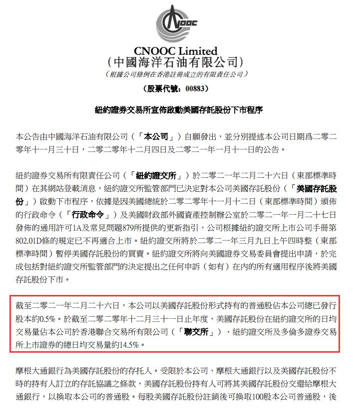当地时间2月26日,美国纽约证券交易所决定,正式启动中国海洋石油有限公司(简称:中海油)美国存托凭证(NYSE:CEO)的正式摘牌程序。