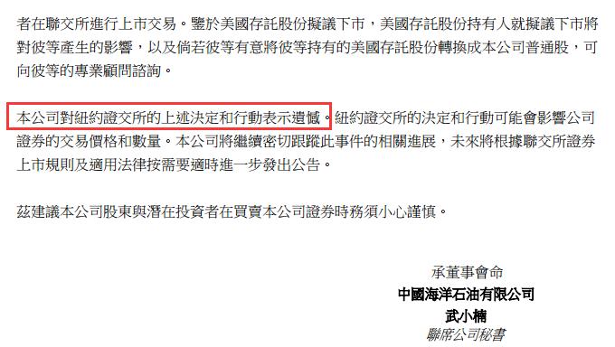 中海油对纽约证交所的上述决定和行动表示遗憾,将继续密切跟踪此事件的相关进展,未来将根据联交所证券上市规则及适用法律按需要适时进一步发出公告。