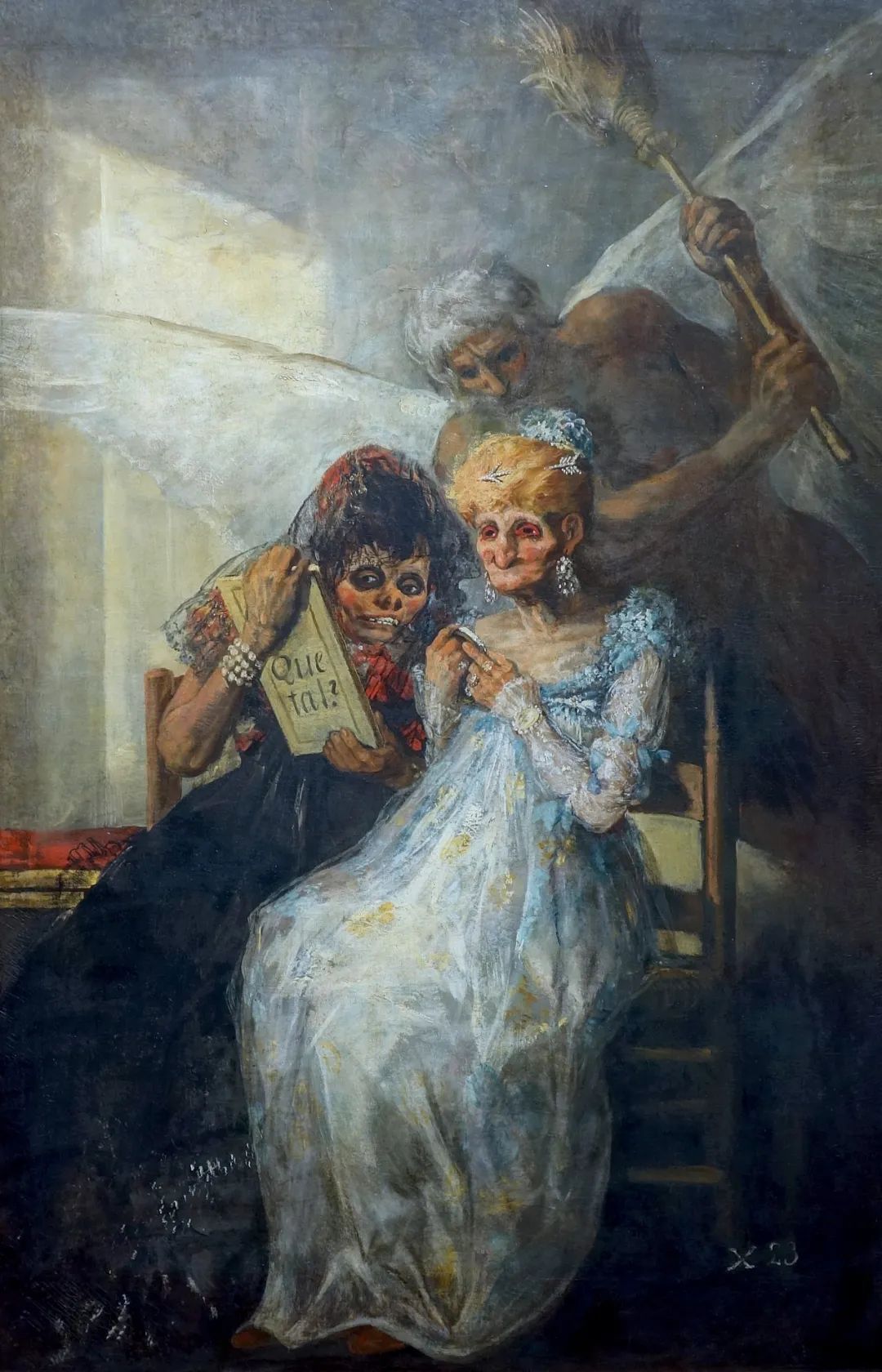 由于当时贵族妇女流行cosplay“马哈小妞”来为自己作肖像,因此也有一说:戈雅画中的马哈是十三世阿尔瓦女公爵,她是戈雅最喜欢的女模特。有意思的是,戈雅曾为女公爵创作了两幅和上文提到的《老妪与时间》以及《红衣男孩肖像》风格类似的怪模怪样的肖像画: