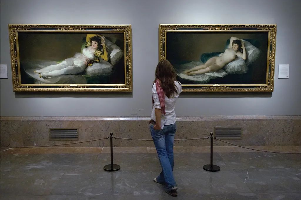 西班牙首都马德里普拉多博物馆的镇馆之宝中不仅有委拉斯凯兹(Diego Velázquez,1599-1660)的代表作 ,更有戈雅的两幅“马哈卧像”——《裸体的马哈》(La maja desnuda,1795-1800)和《穿衣服的马哈》(La maja vestida,1800-1805)。