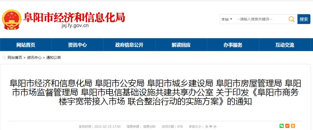 各县(市、区)经济和信息化局、公安(分)局、城乡建设局、房屋管理局、市场监督管理局、电信基础设施共建共享办公室,阜阳经开区投资促进中心、公安分局、自然资源和建设局、市场监督管理局,阜合现代产业园区经贸局、公安分局、规划建设局,移动阜阳分公司,联通阜阳分公司,电信阜阳分公司,安广网络阜阳分公司:根据《安徽省通信管理局 安徽省经济和信息化厅 安徽省公安厅 安徽省住房和城乡建设厅 安徽省市场监督管理局关于开展安徽省商务楼宇宽带接入市场联合整治行动的通知》(皖通信联〔2020〕61号)要求,结合我市实际,制定《阜阳市商务楼宇宽带接入市场联合整治行动实施方案》,现印发给你们,请认真贯彻落实。