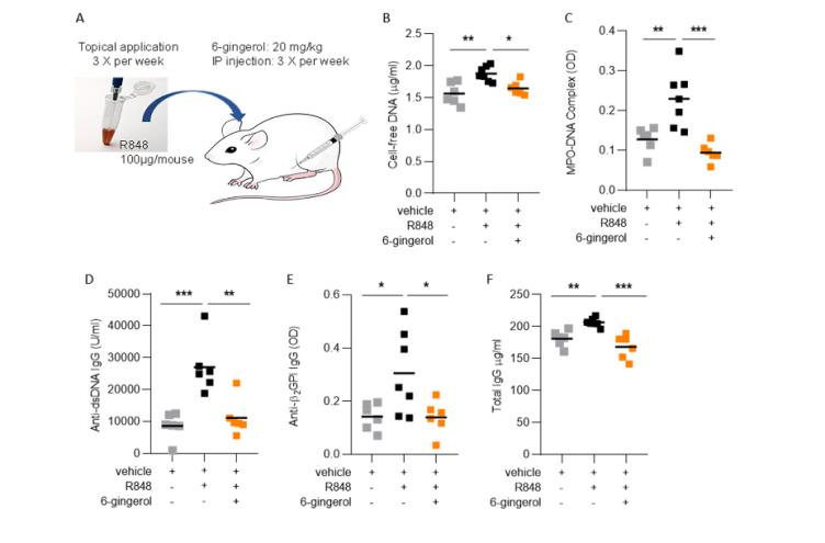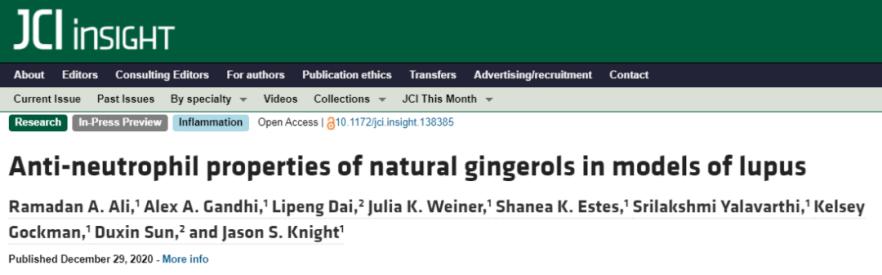 回到开头这项研究,研究人员发现生姜根茎中最丰富的生物活性化合物6-姜油醇具有抗嗜中性粒细胞特性,可对抗小鼠中的SLE和APS等自身免疫性疾病。