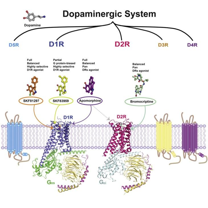 2021年2月细胞出版社旗下期刊Cell上发表了两篇来自中国科学家的关联性研究,分别为中科院上海药物研究所徐华强团队等的“Structural insights into the human D1 and D2 dopamine receptor signaling complexes”,以及四川大学华西医院邵振华团队等的“Ligand recognition and allosteric regulation of DRD1-Gs signaling complexes”,分别阐述了多巴胺信号传导的分子理解,多巴胺受体的配体识别、激活机理以及信号转导选择。为针对多巴胺能系统的药物设计提供了多种结构模板,也为神经疾病的治疗药物开发奠定了重要基础。
