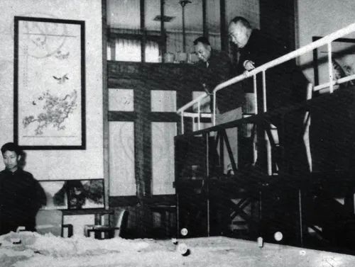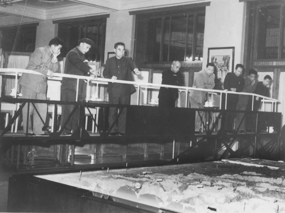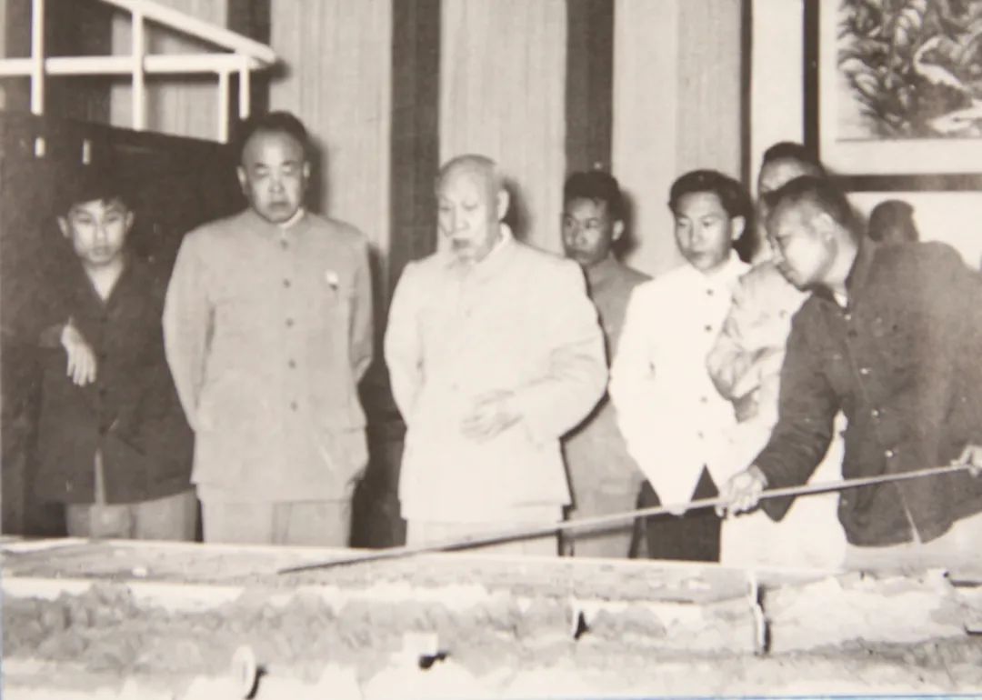 周恩来总理、李富春副总理在人民大会堂观看川汉线模型。由于中央领导很忙,不可能集中一起来听汇报,因此,展出的时间为10月至12月。开始是我们5个人汇报,后来只留下方院长和我汇报。