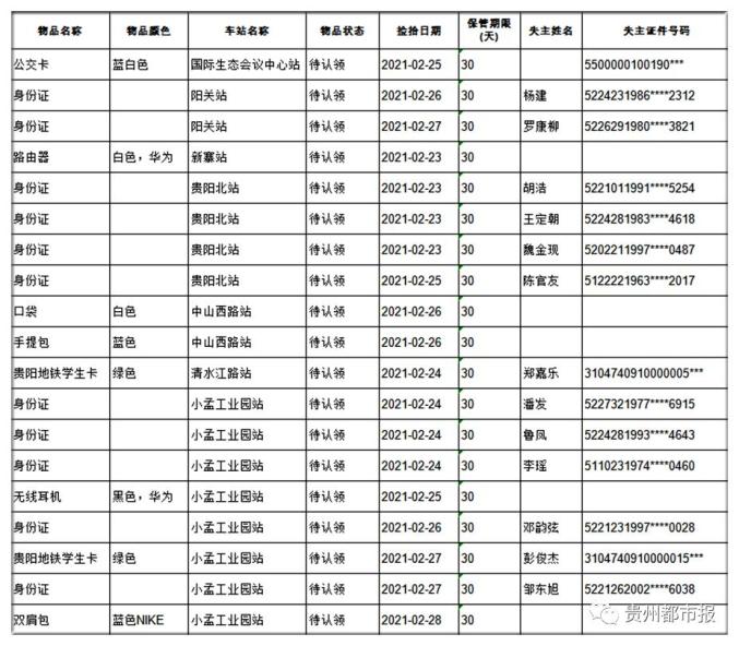 3月1日,贵阳市城市轨道交通集团发布消息,2021年2月22日-28日,在贵阳地铁1号线共拾获物品19件。