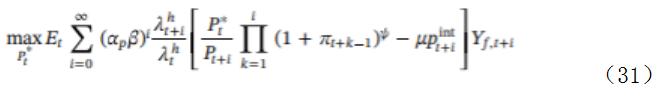 名义刚性是基于卡尔沃公式引入的,在这个公式中,每个时期只有一小部分(1−αp)零售企业可以重置价格。此价格用Pt*表示。零售企业的剩余部分αp不能调整价格,也不能将价格指数化为滞后通货膨胀率,由参数ψ进行说明。因此,零售企业在t期间调整价格的问题由下式给出: