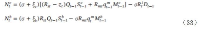 为了找到总的中间资产净值,本文对持续融资的质量ζ和进入融资人的质量ζ(1−σ)求和。持续性中介机构在时间t的净资产由其累积资产存量的净收益构成。假设家庭在每个时期向每种类型的新融资者提供每种中介类型的总资产τ∈{c,b}的一小部分ξτ。然后是传统银行和影子银行资产净值的运动规律,包括来自家庭的总净转移,分别是: