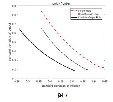 在货币政策传导方面,杠杆调节可以减少银行监管的漏洞,提高金融体系的稳定性,从长期来看可以改善银行的贷款渠道。现在进一步研究不同的杠杆监管规则如何在短期内影响货币政策前沿。其结果如图8所示。很明显,简单规则放大了产出和通货膨胀的波动性(红线)。协调货币和宏观审慎规则(黑线)将货币政策边界实质性地向内移动,信贷增长规则(蓝色虚线)位于这两条线的中间。