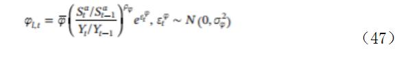 其中φl,t控制着监管下最大银行杠杆率的收紧程度,是传统银行杠杆率的稳态收紧程度。ρφ是逆周期杠杆率的程度。由于货币政策和宏观审慎政策的目标是一致的,本文决定将第三个逆周期杠杆率规则建模为对实体经济和金融部门(分别以产出和信贷为代表)发展的反应: