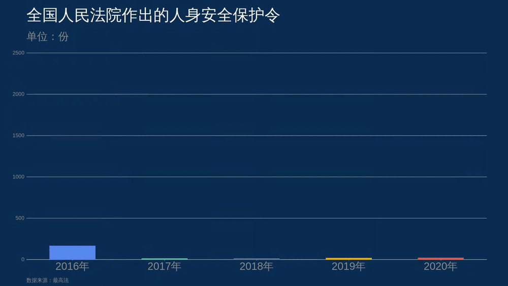 最高法数据显示,从2016年到2020年,全国法院共作出人身安全保护令7918份,呈逐年上升态势,有效维护了家暴受害人特别是妇女、儿童、老年人、残疾人的人身安全和人格尊严。