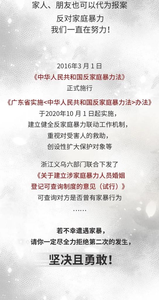 今天,《中华人民共和国反家庭暴力法》已正式实施五周年。我国《民法典》也将禁止家庭暴力作为婚姻家庭的禁止性规定明确写入法典。