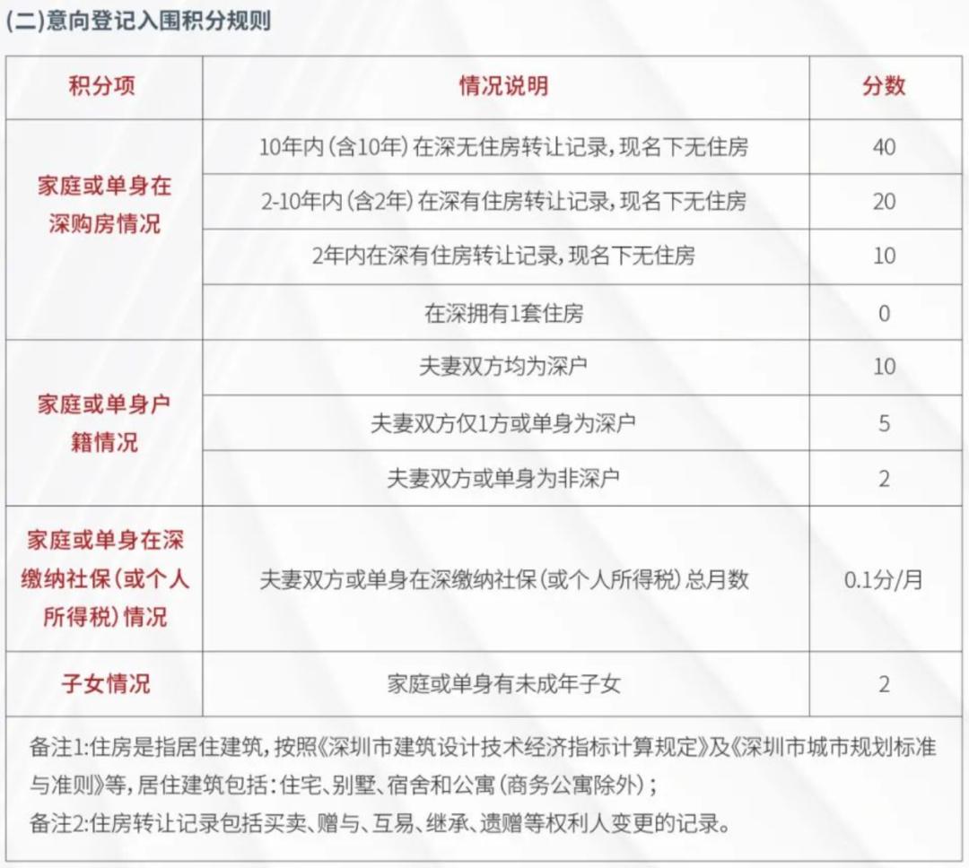 根据两个楼盘公布的意向登记入围积分规则,积分项共分为4大类——无房时长、户籍、社保、子女,其中最引人关注的,莫过于对于在深购房以及社保缴纳两项的积分细则。首先是在深购房情况,10年内在深无住房转让记录且名下无房的,积分最高为40分;2-10年内在深无住房转让记录且名下无房的,积20分;2年内有住房转让记录且名下无房的,积10分;名下有房不积分。同时,购房者还可按照0.1分/月的规则,计算社保累计缴纳时长积分。