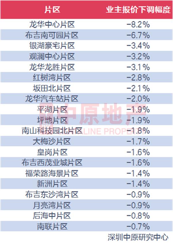 深圳中原研究中心报告显示,2月最后一周(2月21日-2月27日),深圳20个片区的二手房出现业主报价下跌,其中龙华中心片区跌幅最大,跌幅为8.2%,红树湾片区、南山科技园北片区、后海中片区等热点区域亦在下跌之列。