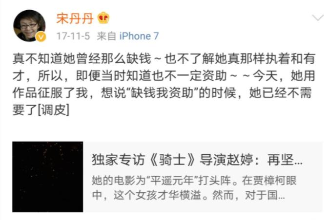 2017年,宋丹丹也是看了人物专访才知道她的拍摄经历,发微博表示“真不知道她那么缺钱”。