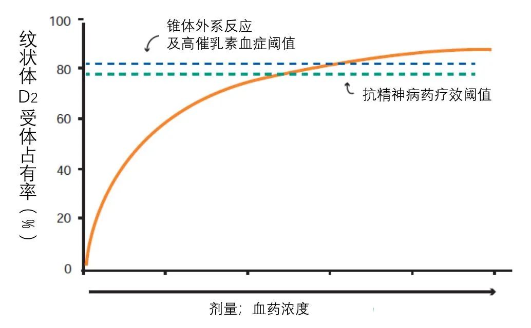 图1 低剂量起始、缓慢加量有助于降低锥体外系反应及高催乳素血症的发生风险(编译自Stahl, 2013)