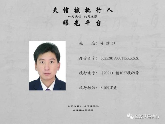 本次曝光人员为截止2021年3月3日前拒不履行生效法律文书确定义务的被执行人。原标题:《金溪县人民法院公布2021年失信被执行人名单》
