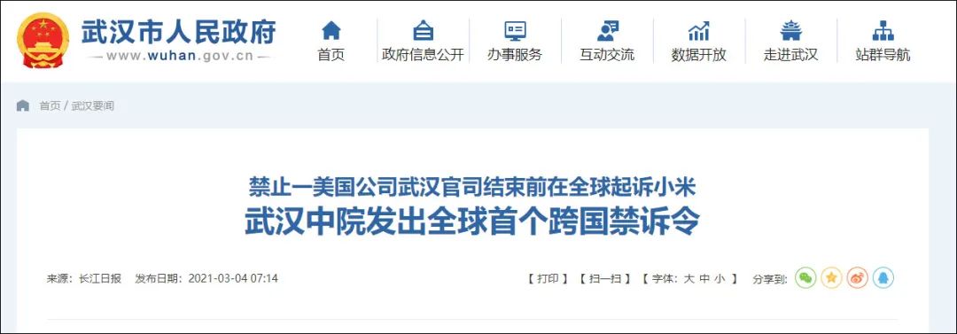 3月4日,武汉市人民政府网站发布消息,武汉市中级人民法院(下称:武汉中院)针对小米集团与美国专利巨头交互数字公司(Inter Digital,下称:交互数字)及其关联公司的专利纠纷案发出全球首个跨国禁诉令。