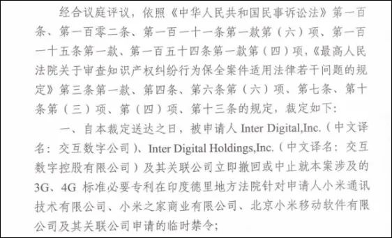 8月4日,小米向武汉中院提出禁诉令保全申请,以制止交互数字通过针对小米及其关联公司发动的禁令措施对本案审理的干扰和妨碍。