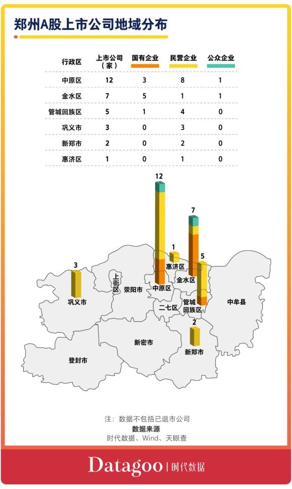 从上市公司地域分布来看,拥有郑州高新技术产业开发区的中原区汇集的上市公司最多,达到12家,其中,民营企业有8家、国有企业有3家、公众企业有1家。其后,金水区拥有7家上市公司,其中,国有企业有5家、民营企业和公众企业各有1家。此外,拥有郑州经济技术开发区的管城回族区拥有上市公司5家。