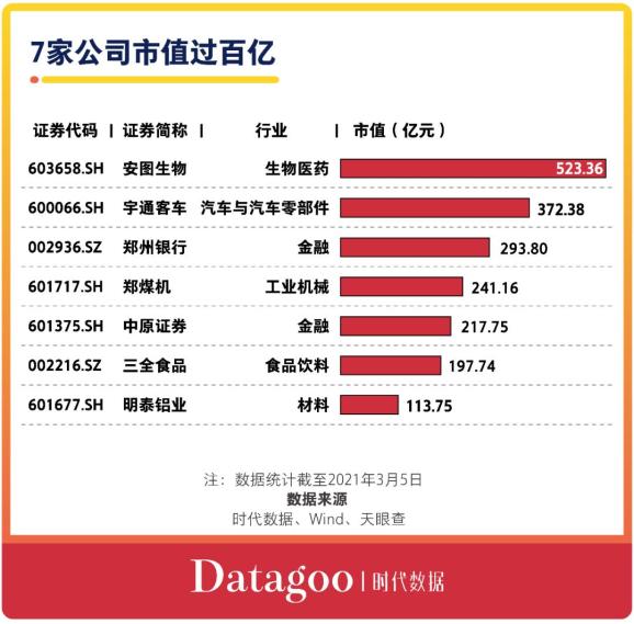 从公司来看,国内体外诊断(IVD)领军企业安图生物(603658)的市值第一,达到523.36亿元;其次是宇通客车(600066),市值达到372.38亿元;紧随其后的郑州银行(002936),市值达到293.8亿元。此外,郑煤机(601717)、中原证券(601375)的市值均在200亿元之上。