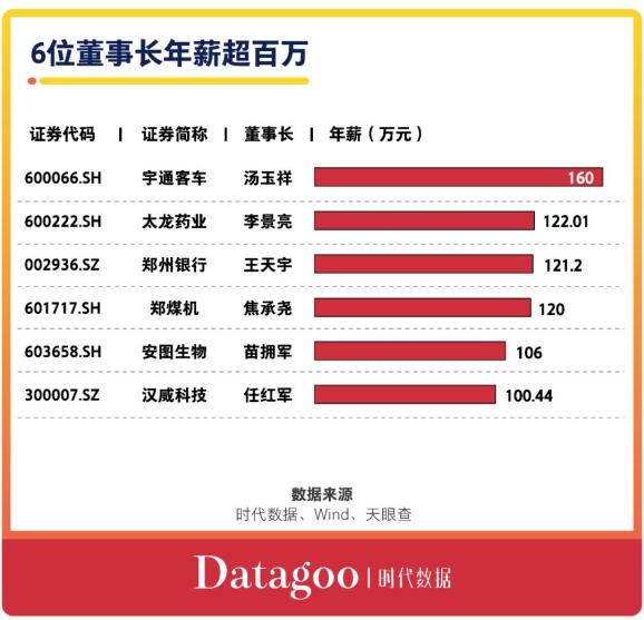 6位董事长年薪超百万据时代数据统计,在这30家公司中,一共有6家公司的董事长2019年年薪超过100万元。其中,最高的是宇通客车(600066)董事长兼总经理汤玉祥,年薪达到160万元;其次是太龙药业(600222)董事长李景亮,年薪122.01万元;第三是郑州银行(002936)董事长王天宇,年薪121.2万元。