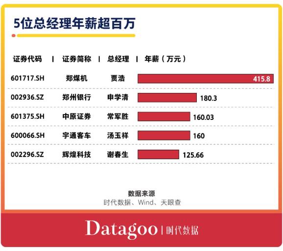 5位总经理年薪超百万据时代数据统计,在这30家公司中,一共有5家公司的总经理2019年年薪超过100万元。其中,年薪排第一的是郑煤机(601717)总经理贾浩,年薪高达415.8万元;其后,郑州银行(002936)行长申学清,年薪达到180.3万元。此外,中原证券(601375)总经理常军胜以160.03万元年薪排在第三。