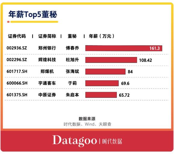 2位董秘年薪超百万据时代数据统计,在这30家公司中,仅2家公司的董秘2019年年薪超过100万元。其中,最高的是郑州银行(002936)董秘傅春乔,年薪161.3万元;辉煌科技(002296)董秘杜旭升紧随其后,年薪108.42万元。