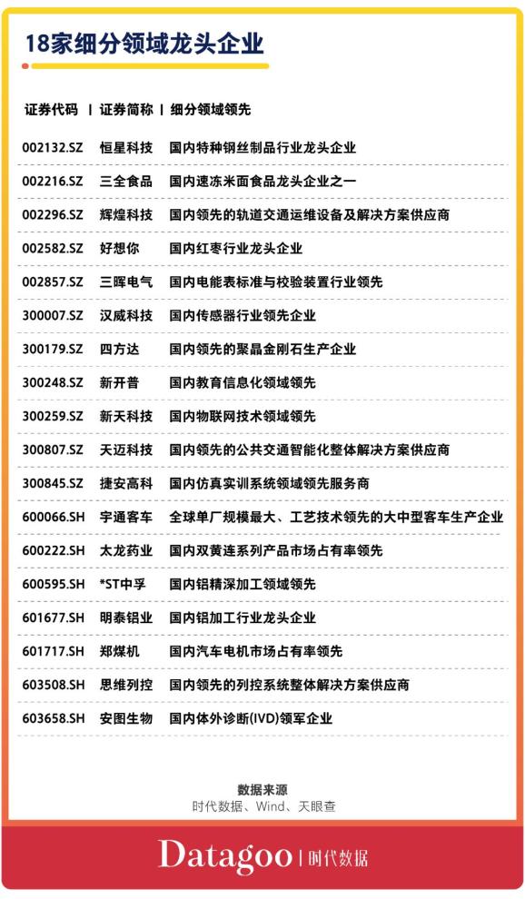据时代数据梳理,在30家公司中,有18家属于各行业细分领域的龙头型企业,占比达到六成。其中,宇通客车(600066)已是全球单厂规模最大、工艺技术领先的大中型客车生产企业;太龙药业(600222)生产的双黄连系列产品在国内市场占有率领先,也是目前有效的广谱抗病毒药物之一。