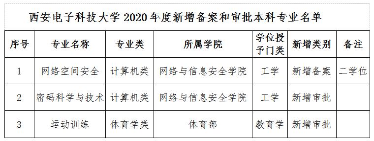 日前,教育部印发了《教育部关于公布2020年度普通高等学校本科专业备案和审批结果的通知》,确定同意设置的备案专业、国家控制布点专业和新增目录外专业点名单。西安电子科技大学新增备案第二学位本科专业“网络空间安全”,新增审批本科专业“密码科学与技术”和“运动训练”,其中“密码科学与技术”为全国首批7所新增高校之一。