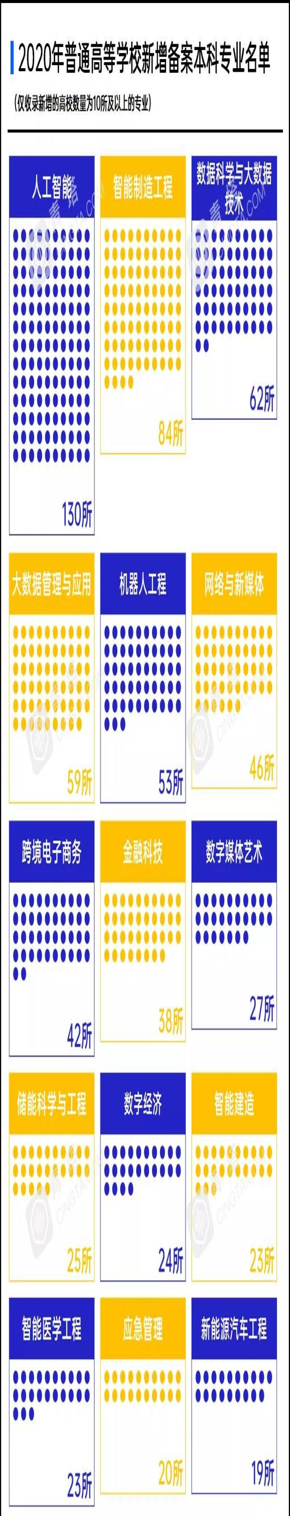 据悉,2020年度全国高校新增备案专业2046个、审批专业177个;调整学位授予门类或修业年限专业93个,撤销专业518个,列入普通高等学校本科专业目录的新专业37个。