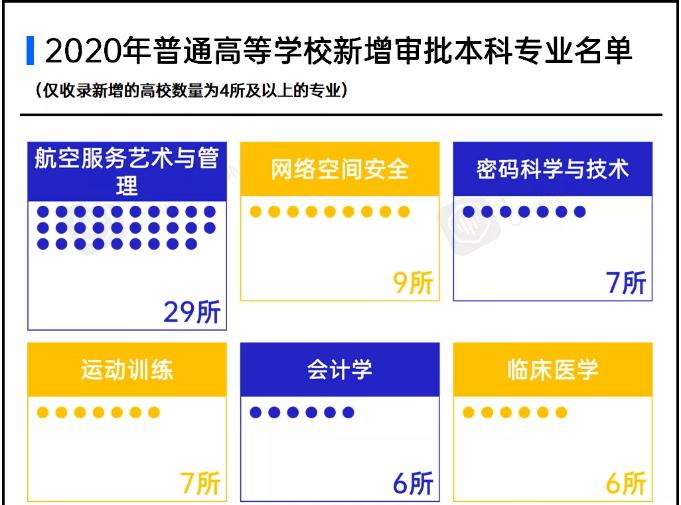 新增审批专业中,航空服务艺术与管理和网络空间安全分别有29所和9所高校新增,超过其他专业,位居第一位和第二位,密码科学与技术和运动训练等专业新增高校7所,位居第三。