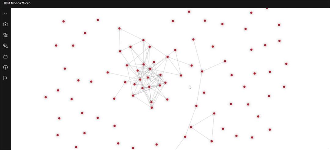 Mono2Micro 界面图。Mono2Micro 利用 AI 集群技术将相似的代码分组在一起,从而更清晰地展示了代码组之间的交互方式。Mono2Micro 在提取代码后,将静态(在程序运行之前对其进行分析)和动态(在程序运行期间对其进行分析)地对源代码和目标代码进行分析。