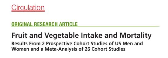 在护士健康研究、卫生专业人员随访研究和24项已发表的研究中,水果和蔬菜摄入量与死亡率之间的剂量反应关系通过对比分析,研究人员发现:
