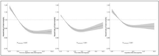 在对已知和可疑的混杂变量和危险因素进行校正后,研究人员观察到水果和蔬菜摄入量与总死亡率和癌症、心血管疾病和呼吸系统疾病引起的特异性死亡率之间呈非线性逆相关关系。