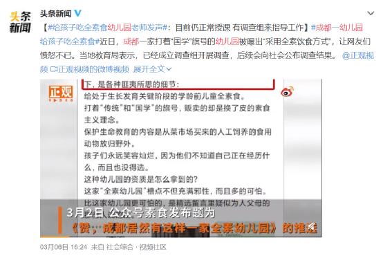 素食饮食正在流行,但显而易见的是长期素食对健康会产生不利影响。目前,在全球范围内包括美国、英国、法国等国家及中国香港和台湾等地区的学校大多采用晚餐提供免费素食或间断性素食方案,上述成都幼儿园的“顿顿全素饮食”方案也是很少见的案例。