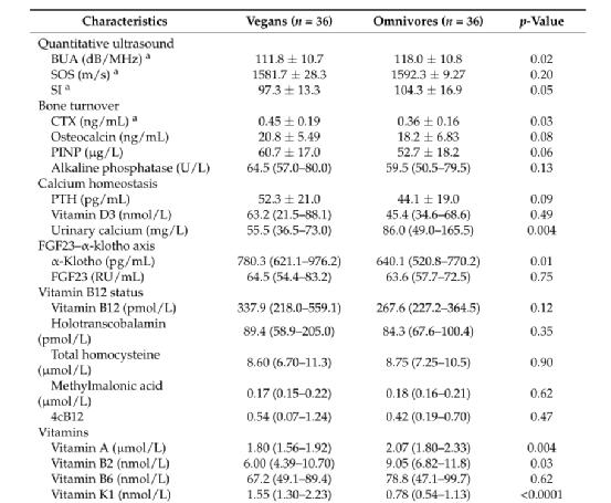 纯素食或杂食者骨参数和生物标志物的特征(部分截图)