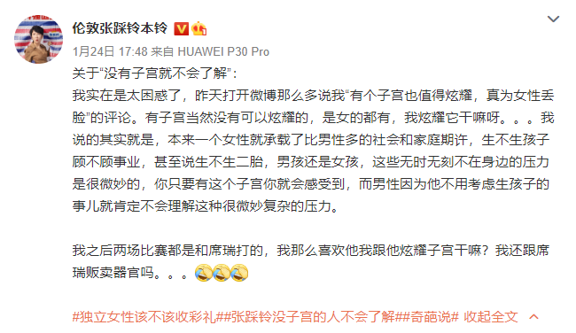 张踩铃微博回应她在节目中所说的“你没有子宫就不会了解”