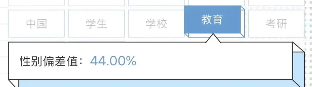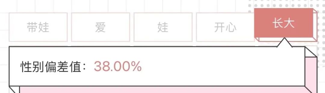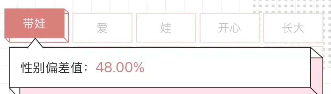 而男性在育儿话题中提到的高频词条包括:「学区房」「择校」「教育」,这三个关键词的性别偏差值均达到了44%以上,可以看出,男性在育儿问题上会更多思考孩子的教育,以及外部环境的改善,也更容易产生经济相关的压力。