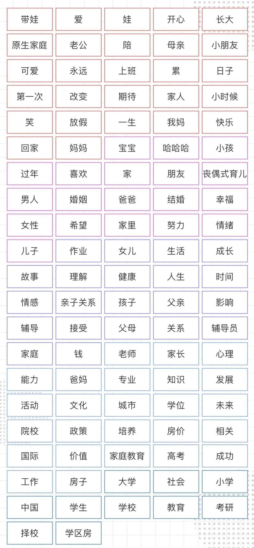 以“育儿”这个话题为例,互联网上男女用户之间的用语差异又有哪些呢?