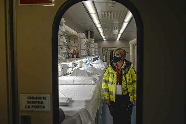 当地时间2021年3月8日,意大利首都罗马,当地中心火车站部分列车车厢改为新冠患者收容病房。人民视觉 资料图