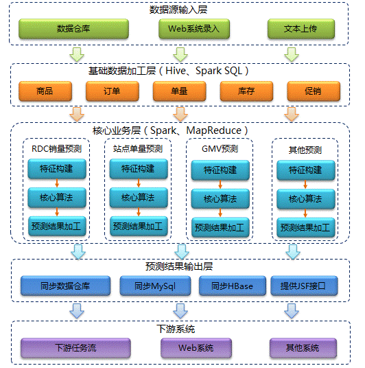 再往下细分,更是一系列晦涩难懂的名词,毕竟该预测系统的核心层技术都有基础层、框架层、工具层和算法层,复杂之程度代表了它的设计之精细。下图是预测系统架构。