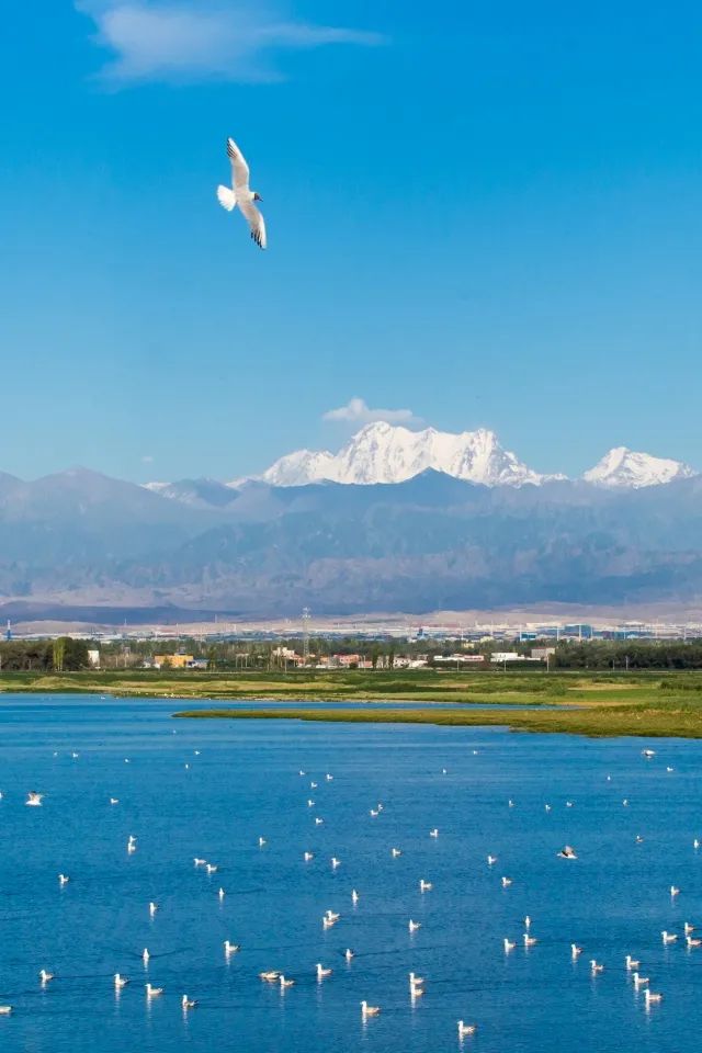 乌鲁木齐市米东区塔桥湾水库,栖息的水鸟、蓝天碧水、博峰雪山形成美丽景致(新疆日报全媒体记者 阳光/摄)