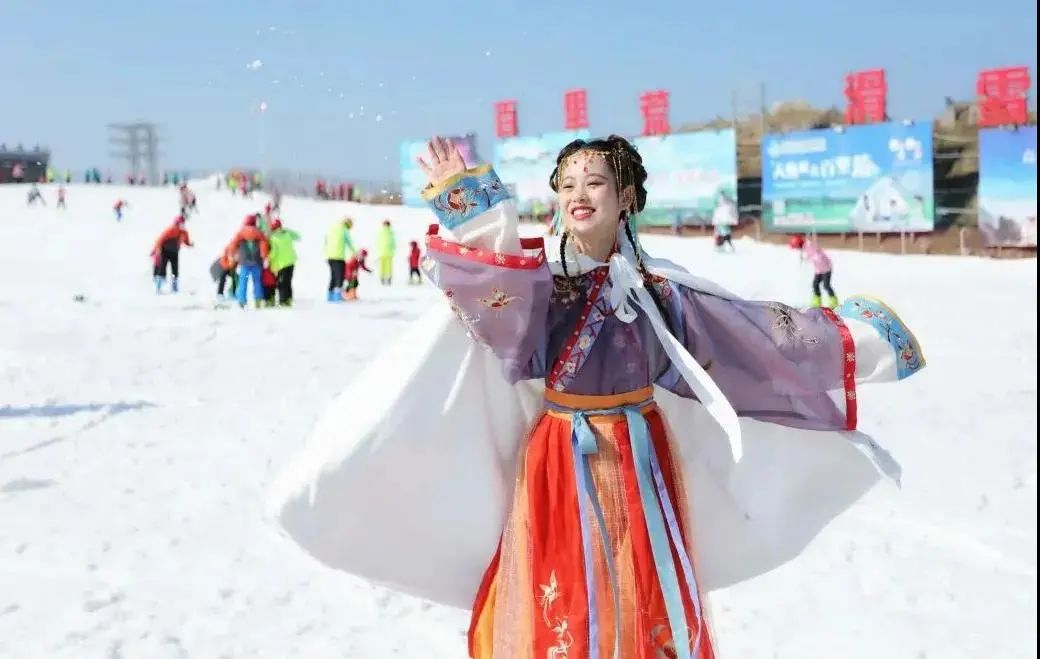 △温婉红装与滑雪激情的结合,让人回味无穷今年百里荒、五峰国际滑雪场均举办了以“国风”、“汉服”为主题的系列活动,还融合当地非遗文化、民俗风情等打出“组合拳”。