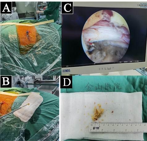 术中操作照片(A:术中置管,B:术中摘除椎间盘组织,C:术中减压情况,D:术后取出的大量椎间盘组织)